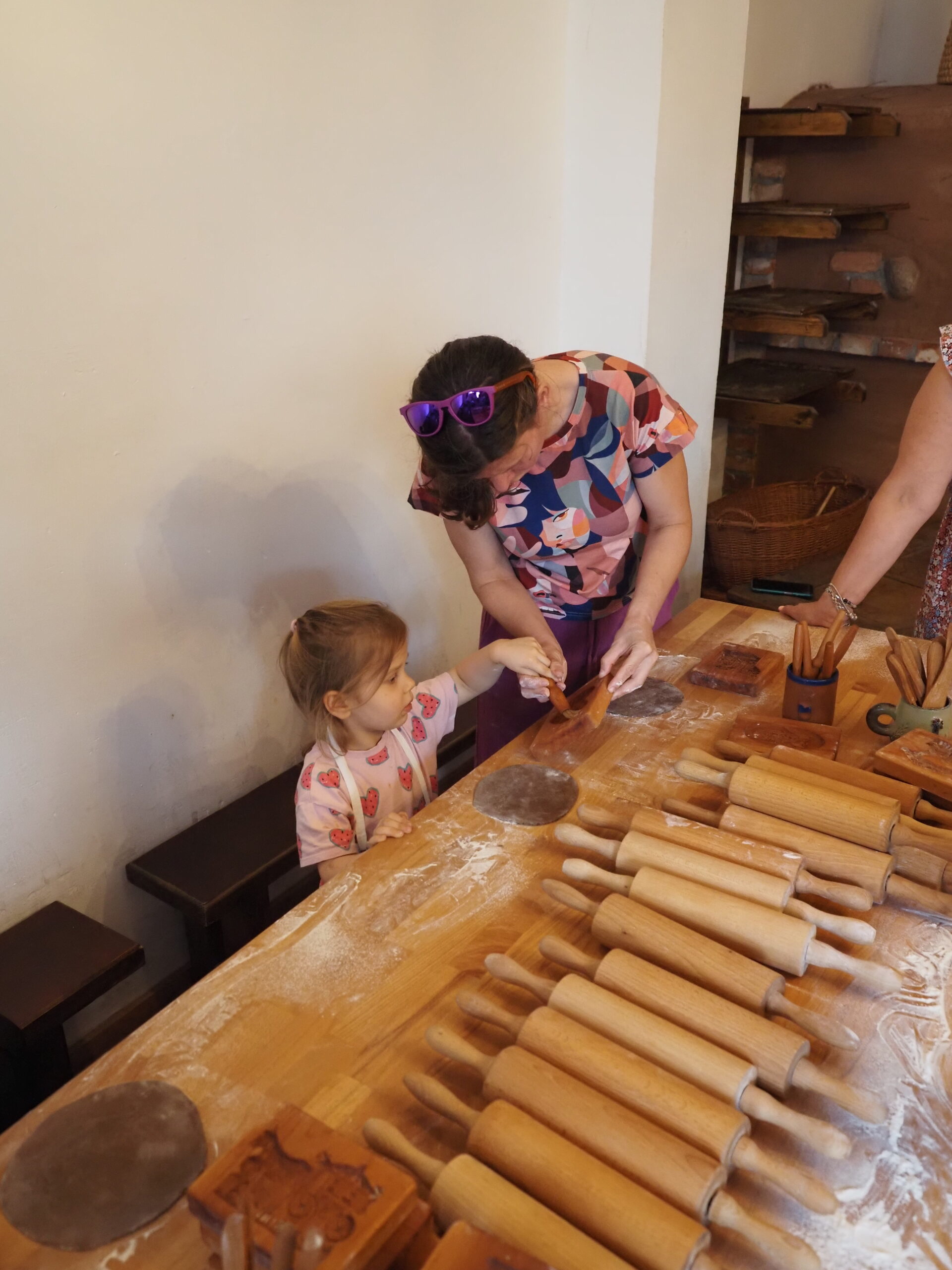 Kolejnego dnia, po zaliczeniu wieży widokowej, ruszyliśmy kamperem do Torunia. Zaczęliśmy z przytupem od seansu dla dzieci w tamtejszym planetarium, później obiad w przyjemnej włoskiej restauracji z ciekawym placem zabaw i dobrym jedzeniem. Następnie przyszedł czas na warsztaty lepienia pierników, które okazały się dużą atrakcją – młoda była zachwycona luźnym podejściem ekipy prowadzącej. Potem klasyka – lody, magnesik, spacer po starówce i zdjęcie pod Kopernikiem. Czas minął zdecydowanie za szybko i kontynuowaliśmy naszą trasę kamperem w poszukiwaniu wody.