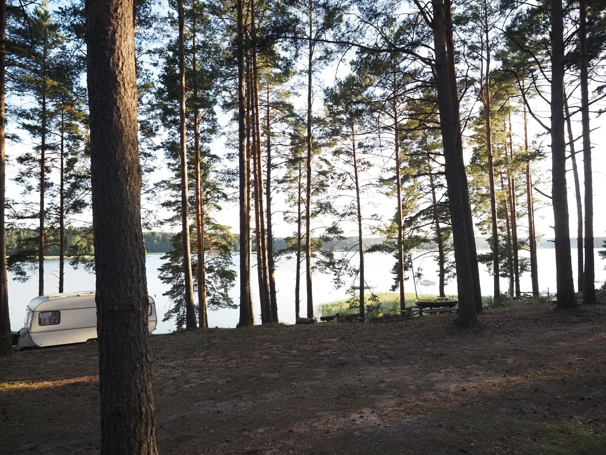 Miejsce na kolejny nocleg kamperem znaleźliśmy klasycznie w aplikacji Park4night. Trafiliśmy nad jezioro Gołuń i był to strzał w dziesiątkę, choć samo miejsce nie jest łatwe do znalezienia – wjazd jest nieoznakowany i prowadzi leśną ścieżką, ale zdecydowanie warto się trochę pomęczyć i go poszukać.