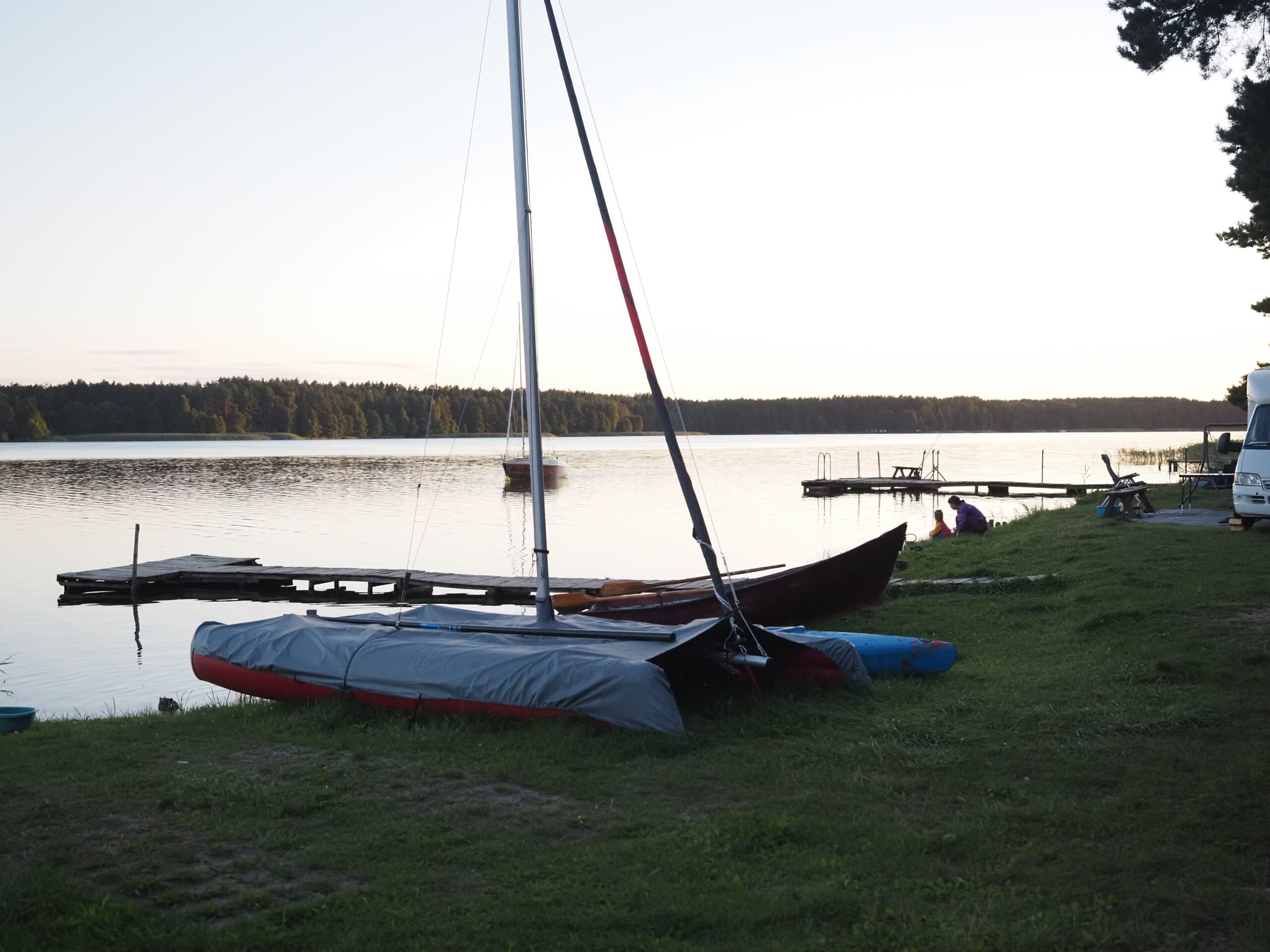 Po powrocie nad jezioro Gołuń nie było mowy o odpoczynku na sucho – młoda od razu zaczęła temat kąpieli i nie odpuściła, dopóki nie weszliśmy do wody. Resztę dnia spędziliśmy, relaksując się nad wodą i ogarniając kolację, a wieczorem Basia „dyskretnie” wprosiła się na ognisko do lokalnych kamperowiczów.